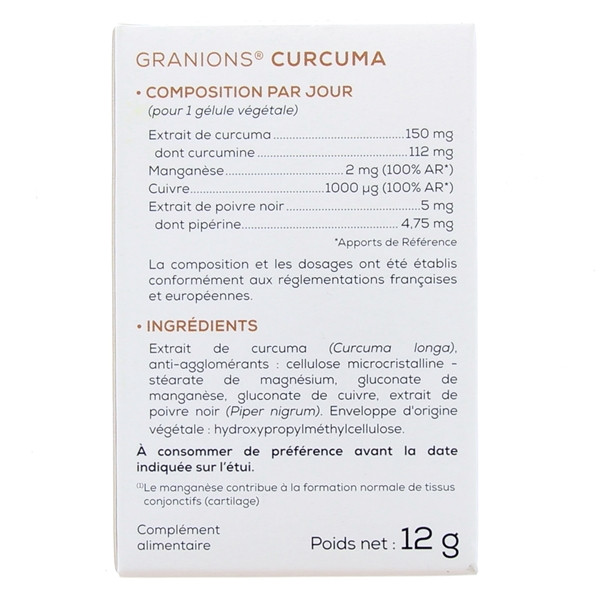 Granions Curcuma est un complément alimentaire sous forme de gélules qui sont présentées dans une boîte contenant 30 gélules végétales. Ce produit profitant des avancées scientifiques améliore la santé en stimulant la formation du cartilage. De plus, ce complément alimentaire a une excellente biodisponibilité qui est de 40 fois plus que celle du curcuma standard.