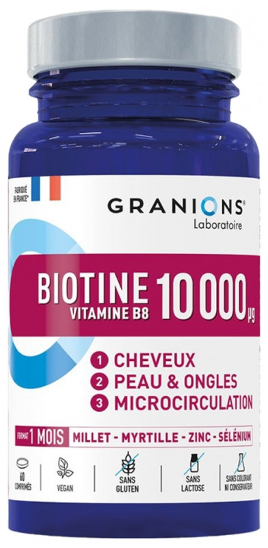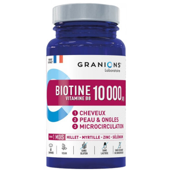 Le complément alimentaire Biotine 10000 µg du laboratoire Granions active la microcirculation du cuir chevelu et contribue au maintien d'une peau normale et d'ongles normaux.