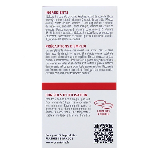 Édulcorant : sorbitol, L-cystine, kératine, extrait de roquette (Eruca vesicaria), arôme naturel, vitamine C, extrait de ben ailée (Moringa oleifera), citrate de zinc, vitamine E, anti-agglomérant : stéarate de magnésium, acidifiant : acide malique, vitamine B3, extrait de grenadier (Punica granatum), vitamine D, vitamine B12, vitamine B6, édulcorant : sucralose, édulcorant : acésulfame de potassium, édulcorant : saccharinate de sodium, gluconate de cuivre, vitamine B8, vitamine B9, sélénite de sodium.