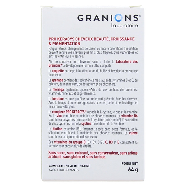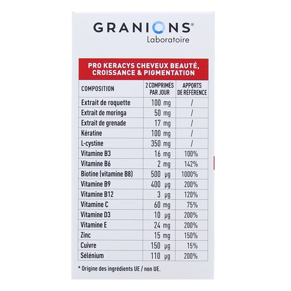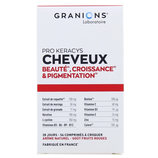 Pro Keracys Cheveux Beauté & Croissance x56cpr à croquer Granions est un produit du laboratoire Granions, un établissement pharmaceutique spécialiste en oligothérapie. Effectivement, il s’agit d’un complément alimentaire conçu pour contribuer à la beauté, à la croissance et à la pigmentation des cheveux. Fabriqué en France, il est conditionné dans une boîte de 60 g contenant 56 comprimés à croquer pour une cure de 28 jours.