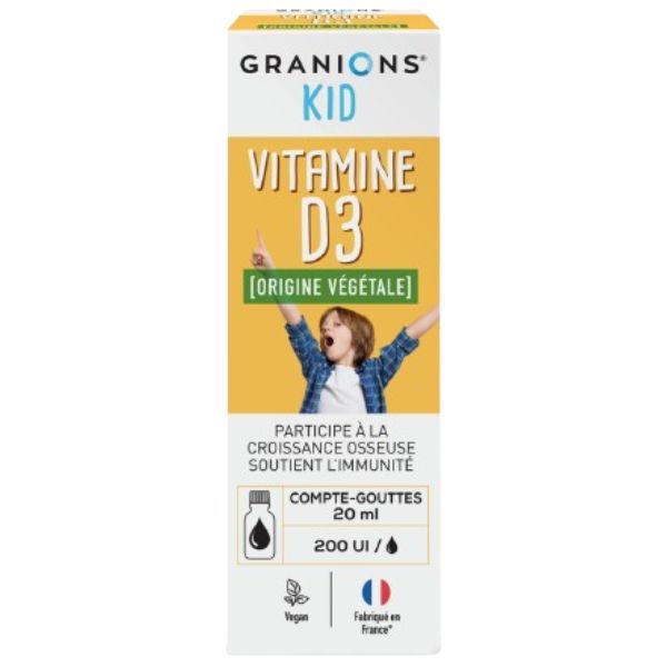 Granions Kid Vitamine D3 200 UI Gouttes est un complément alimentaire destiné à soutenir la croissance osseuse et le système immunitaire des enfants. Sa composition à base de vitamine D3 d’origine végétale, issue du lichen, est idéale pour répondre aux besoins spécifiques des enfants en vitamine D.