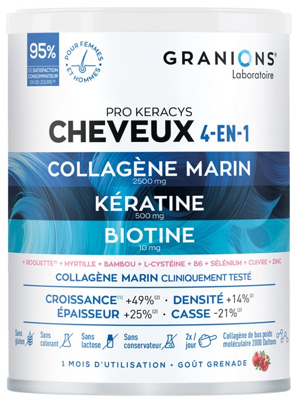 Pro Keracys Cheveux 4en1 du laboratoire Granions possède une formule 4-en-1 exclusive cliniquement testée, boostée en collagène marin, pour favoriser la croissance, la densité et l'épaisseur des cheveux tout en diminuant leur casse. Ce complément alimentaire est destiné aux femmes et aux hommes.