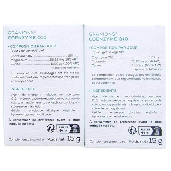 La coenzyme Q10 est un composé naturellement présent dans l’organisme qui joue un rôle essentiel dans la fourniture d’énergie au niveau cellulaire. Sa conception par le corps atteint son pic vers l’âge de 20 ans, puis s’amoindrit progressivement avec le temps. Cette diminution peut entraîner une baisse de la production d’énergie cellulaire et une augmentation du stress oxydatif, ce qui peut contribuer au vieillissement précoce et à diverses pathologies. D’où l’intérêt de recourir à une supplémentation. Ce complément alimentaire Granions apporte une dose suffisante de coenzyme Q10 pour soutenir les fonctions vitales de l’organisme.
