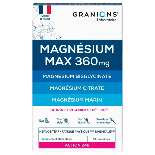 Le complément alimentaire Magnésium Max 360 mg du laboratoire Granions contient du magnésium Bisglycinate, du magnésium Citrate et du magnésium marin pour lutter contre la nervosité, la fatigue physique et mentale.
