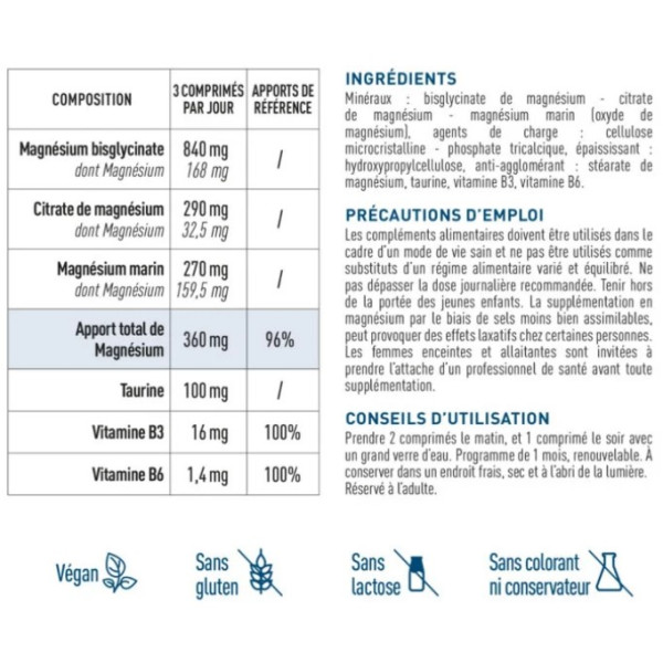 Bisglycinate de magnésium - citrate de magnésium - magnésium marin (oxyde de magnésium), cellulose microcristalline - phosphate tricalcique, hydroxypropylcellulose, stéarate de magnésium, taurine, vitamine B3, vitamine B6.