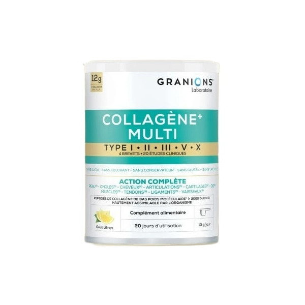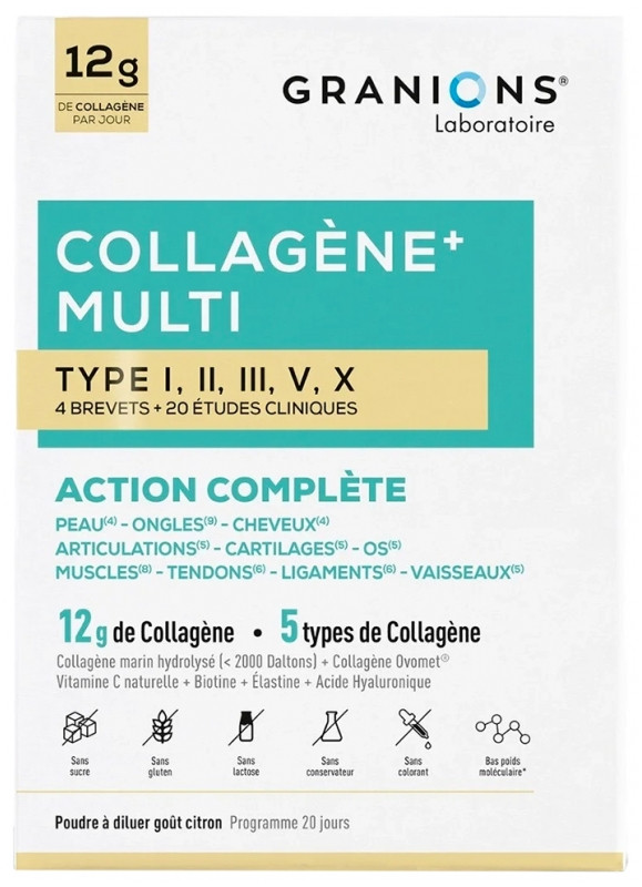 Le complément alimentaire sous forme de poudre Collagène+ Multi du laboratoire Granions est formulé à partir de 5 types de collagène (I, II, III, V et X) pour offrir une action complète. Il agit sur la peau, les ongles, les cheveux, les articulations, les cartilages, les os, les muscles, les tendons, les ligaments et les vaisseaux.