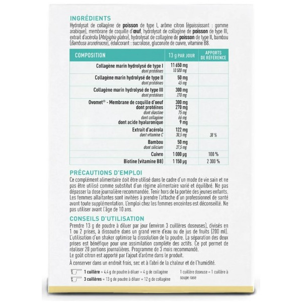 Hydrolysat de collagène de poisson type I, membrane de coquille d’œuf, hydrolysat de collagène de poisson type III, phosphate tricalcique, poudre de jus d’acérola (Malpighia glabra L), cellulose microcristalline, sels de magnésium d’acides gras, hydrolysat de collagène de poisson de type II, gluconate de cuivre, biotine.