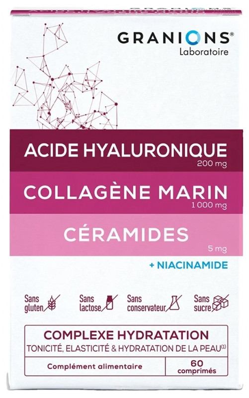 Le Complexe Hydratation Peau du laboratoire Granions est un complément alimentaire contenant de l'acide hyaluronique, du collagène marin, des céramides et de la niacinamide. Il contribue à hydrater, tonifier et renforcer la peau pour maintenir une peau normale.