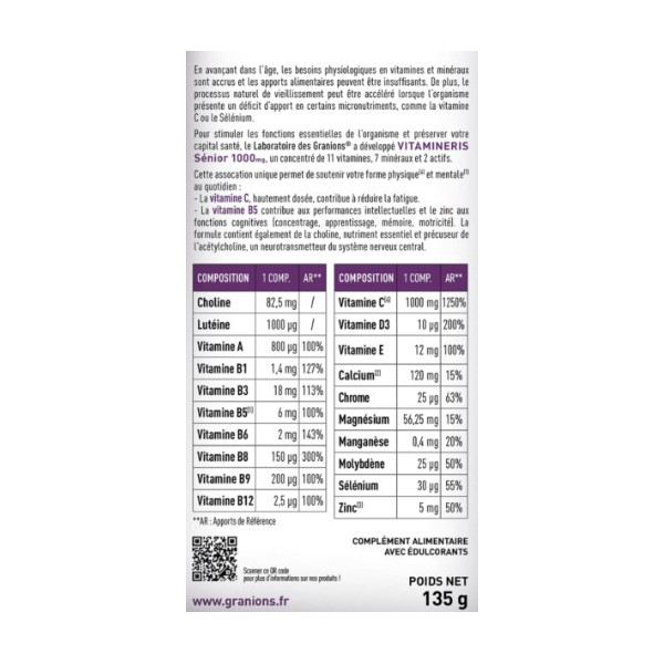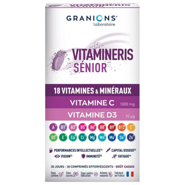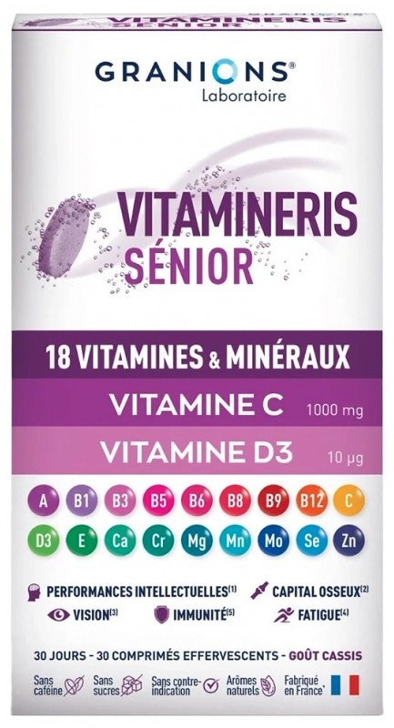 Vitamineris Senior du laboratoire Granions contient 18 vitamines et minéraux pour soutenir la forme physique et mentale.