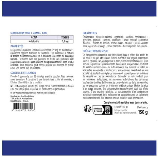 Mélatonine (1,9mg) - agents d’enrobage : huile végétale, cire de carnauba - gummies : sirop de maltitol, - sorbitol, erythritol - épaississant : glycérine - gélifiant : pectine - acidifiant : acide citrique - correcteur d’acidité : citrate de sodium - arôme cassis - colorant : jus de carotte noire.
