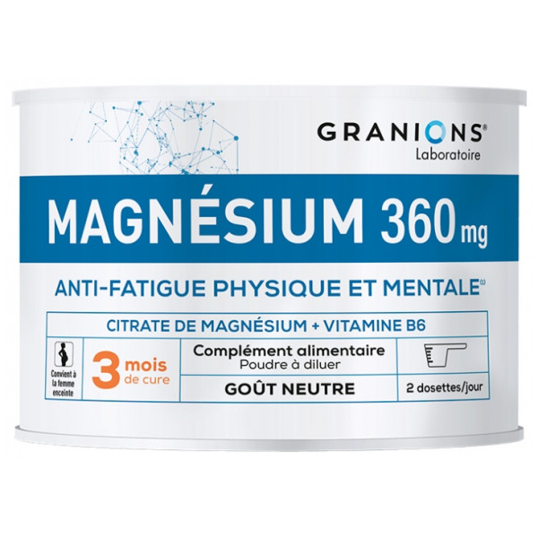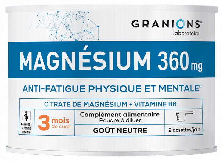 Le Magnésium 360 mg sous forme de poudre du laboratoire Granions contient du citrate de magnésium et de la vitamine B6 pour contribuer au fonctionnement normal du système nerveux et à réduire la fatigue.