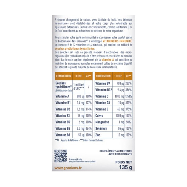 Granions Vitamineris Immunité concentre un milliard de souches probiotiques tyndallisées, 12 vitamines et 4 minéraux. La formule contient de la vitamine A qui aide à garder l’état normal des muqueuses, notamment celles logées au niveau du système digestif où se trouve la majorité des cellules immunitaires. Ce produit comporte aussi de la vitamine C qui intervient dans la réduction de la fatigue et au maintien du métabolisme énergétique. La composition inclut également du zinc qui stimule le fonctionnement du système immunitaire et protège les cellules du stress oxydatif. La consommation de ces comprimés est recommandée durant la période hivernale, les pics épidémiques, les changements de saison, pendant la convalescence, en cas de tension nerveuse et de surmenage. Ce complément alimentaire ne contient ni caféine, ni sucres ajoutés, ni conservateurs, ni colorant artificiel, ni lactose, ni gluten.