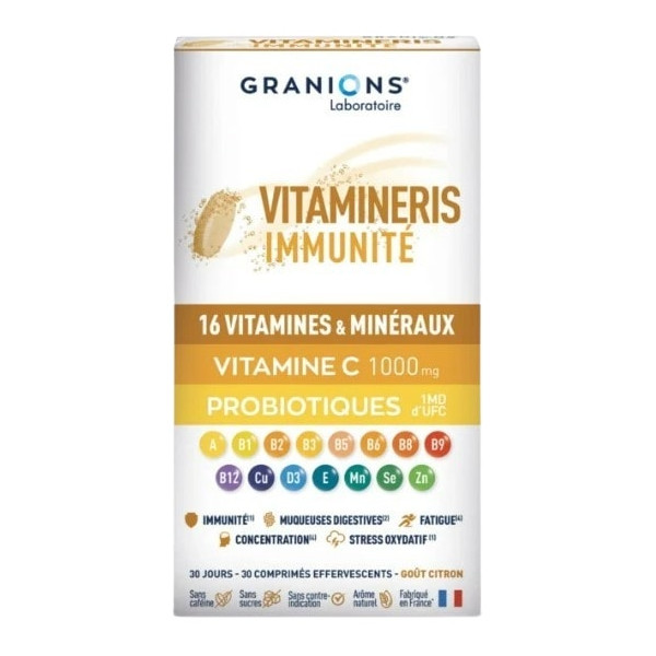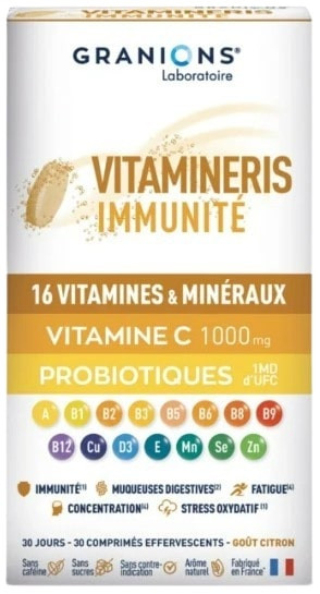 Vitamineris Immunité x30cpr effervescents de Granions renferme 16 vitamines et minéraux ainsi que des probiotiques. Ce complément alimentaire est conçu pour activer les défenses immunitaires et préserver le capital santé.