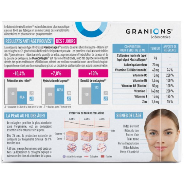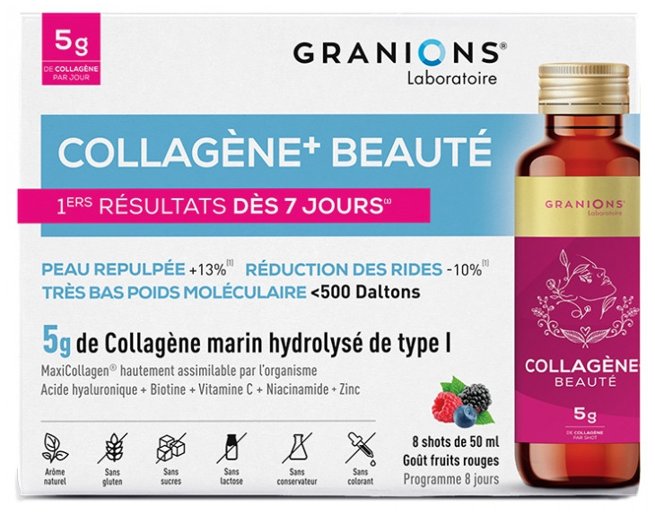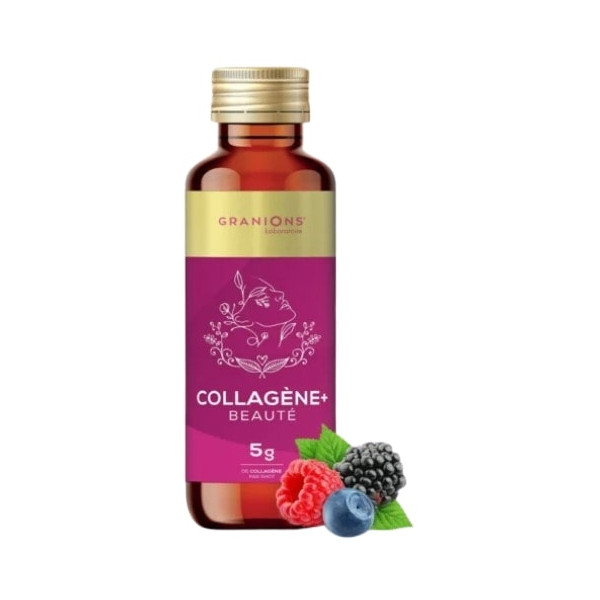 Le complément alimentaire Collagène+ Beauté sous forme de shot du laboratoire Granions contient du collagène marin de type I hydrolysé Maxicollagen pour lutter contre les signes de l'âge. Il contribue à la réduction des rides, à l'hydratation de la peau et à l'augmentation de la densité de collagène.