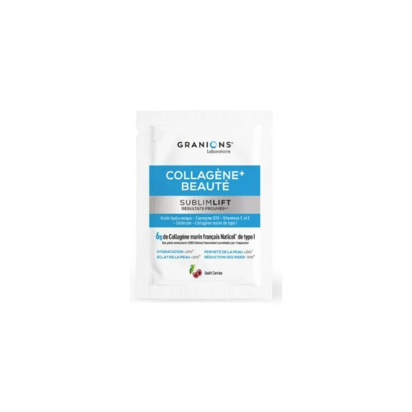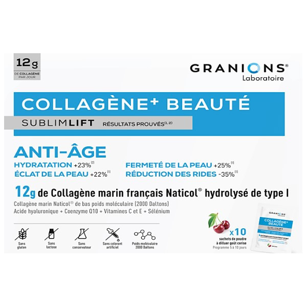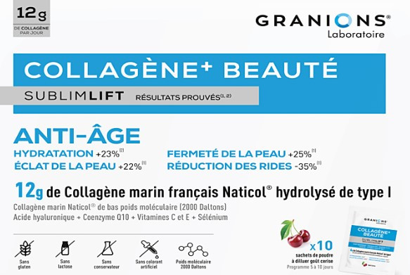 Collagène+ Beauté Sublimliftx10 sachets des laboratoires Granions est un complément alimentaire anti-âge élaboré pour améliorer la fermeté, hydrater en profondeur, rehausser l’éclat de la peau et réduire les rides. Il est disponible sous forme de poudre à diluer au délicieux goût de cerise.