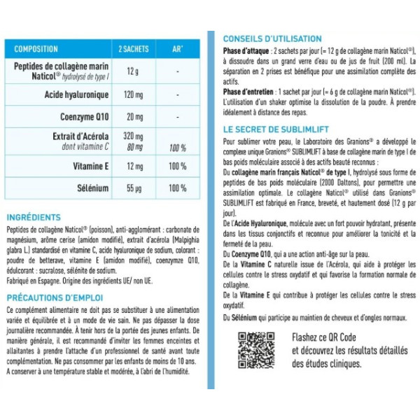 Granions Collagène+ Beauté Sublimlift est un complexe hautement concentré en collagène marin et d’autres actifs reconnus pour leurs bienfaits sur la peau. Il contient du collagène marin français breveté de type 1 Naticol®. Pour faciliter son assimilation, cette substance est hydrolysée sous forme de peptides. La formule inclut aussi de l’acide hyaluronique, une molécule possédant un puissant pouvoir hydratant qui améliore la fermeté et la tonicité de la peau. Ce produit renferme également du coenzyme Q10 qui exerce une action anti-âge, de la vitamine C naturelle extraite de l’acérola et de la vitamine E qui contribuent à la protection des cellules contre le stress oxydatif et stimulent la formation de collagène. Du sélénium complète la composition. Conditionnement : boîte de 10 sachets de poudre à diluer.