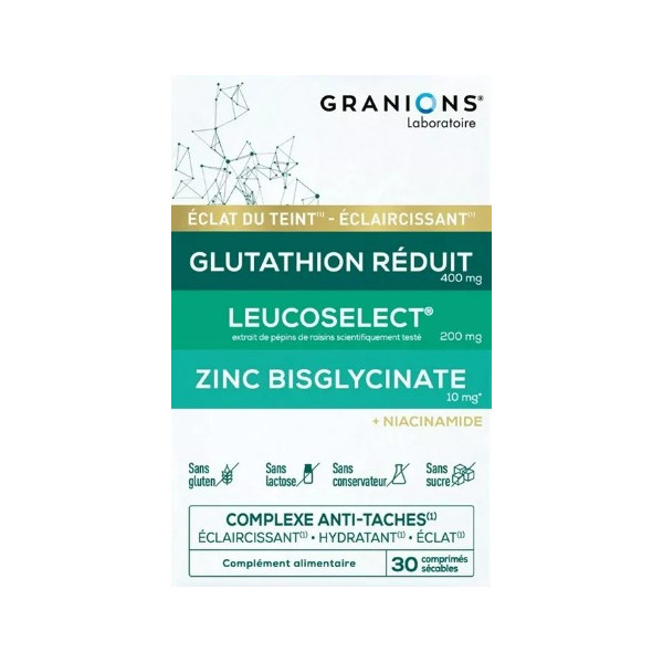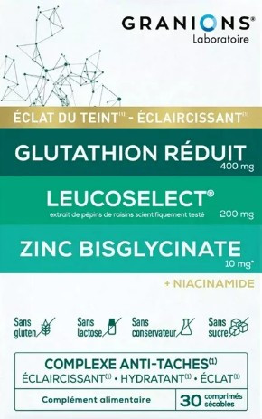 Le Complexe Anti-Taches du laboratoire Granions est un complément alimentaire à base de Glutathion Réduit, Leucoselect®, Zinc Bisglycinate et Niacinamide. Il contribue à réduire les taches pigmentaires, à hydrater la peau et à favoriser l'éclat du teint.