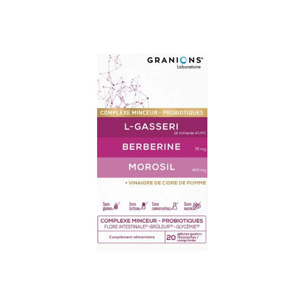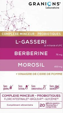 Le Complexe Minceur - Probiotiques du laboratoire Granions est un complément alimentaire triple action à base de L-Gasseri, Berberine, Morosil et vinaigre de cidre de pomme. Il contribue à l'équilibre de la flore intestinale, à brûler les graisses et soutenir un programme minceur, et à maintenir une glycémie normale.