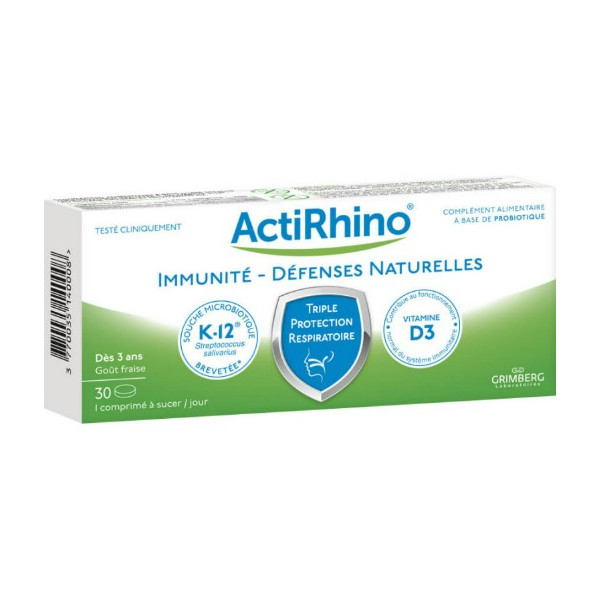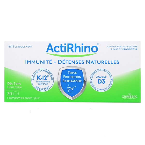 Son format pharmaceutique en comprimés à sucer au goût fraise le rend particulièrement agréable à consommer, aussi bien pour les adultes que pour les enfants dès trois ans. Grâce à son conditionnement en emballage aluminium, la souche probiotique est protégée pendant sa période d’utilisation. ActiRhino® est disponible en boîte de 30 comprimés.