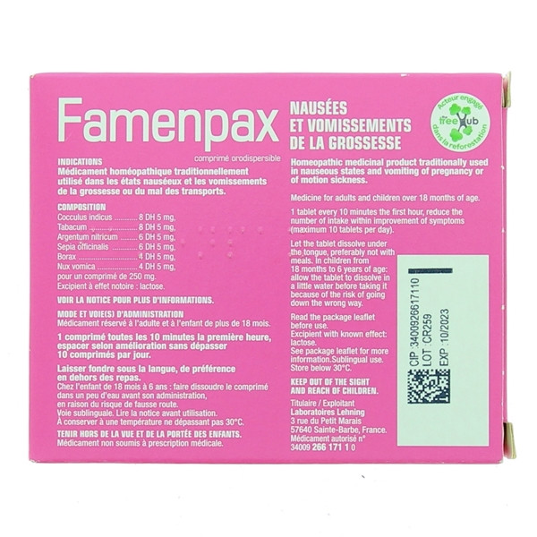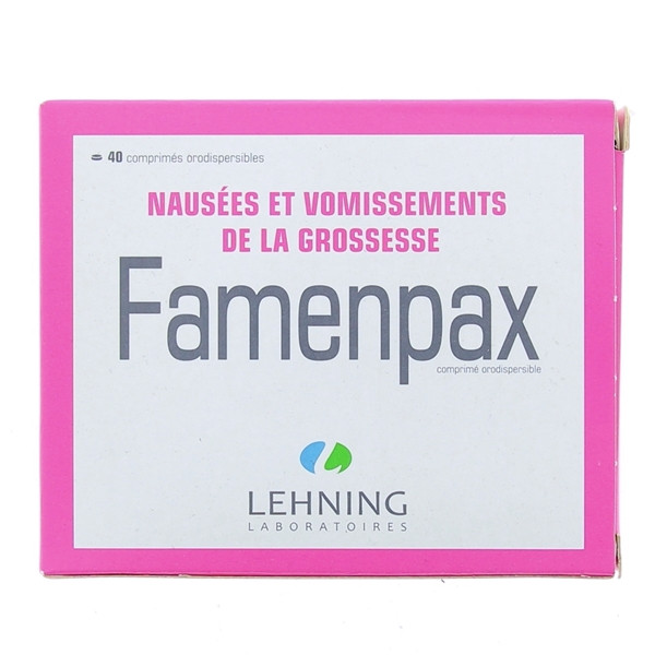 Famenpax est un médicament homéopathique des laboratoires Lehning. Famenpax est recommandé en cas de nausées et vomissements pendant la grossesse. Famenpax peut également être utilisé en cas de mal des transports.