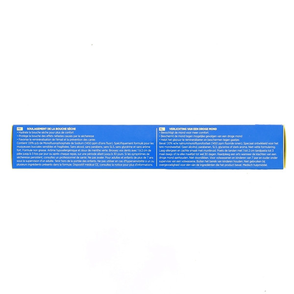 Il réhydrate la bouche sèche et restaure le confort buccal. Il favorise également la régénération des tissus muco-gingivaux et restaure l’équilibre de la flore buccale. Riche en fluor, il favorise la reminéralisation de l’émail dentaire et contribue à la prévention des caries. De plus, le monofluorophosphate de sodium présent dans ce dentifrice agit comme un agent antibactérien. Il améliore la protection contre les infections buccales.