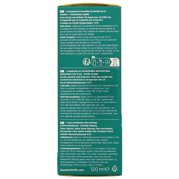Il est indiqué de faire un bain de bouche 2 à 3 fois par jour ou plus si nécessaire avec AftaClear Bain de bouche Aphtes 120ml GUM. Rincez votre bouche avec 10 ml du produit après avoir mangé, et cela, pendant une semaine. Il est recommandé d’éviter de mastiquer quelque chose ou de boire pendant au moins 30 minutes après utilisation.