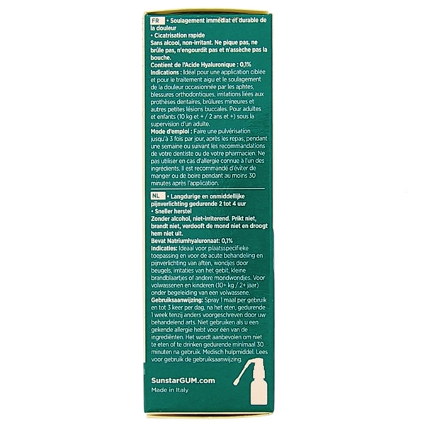 La formule sans alcool de ce spray permet de prévenir tout risque d'irritation de l'intérieur de la cavité buccale. La présence d'acide hyaluronique dans le soin de bouche contribue à l'hydratation de la cavité buccale et à une cicatrisation rapide.