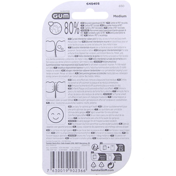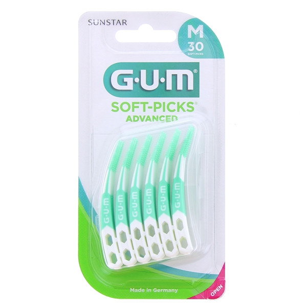 Le bâtonnet interdentaire Soft-Picks Advanced M est un produit de la marque Gum. Il permet de nettoyer les espaces entre les dents, notamment dans les zones difficiles d'accès pour la brosse à dents. Il peut ainsi éliminer les plaques dentaires et les débris d'aliments entre les dents. Ce produit en caoutchouc ne contient pas de métal ni de bois. Sa forme conique lui permet de s'incruster entre les petits espaces entre les dents tandis que sa forme incurvée s'adapte à la forme de la mâchoire pour accéder facilement aux endroits difficiles.