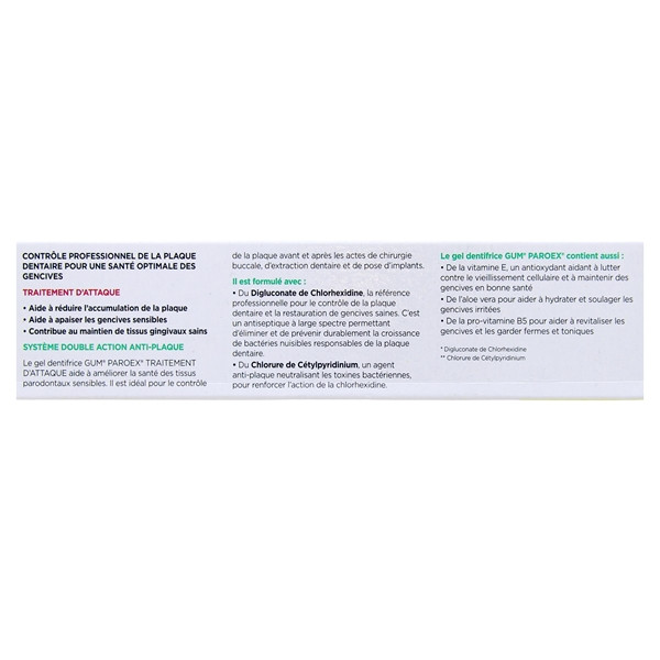 Pour prévenir l'apparition de la plaque dentaire et protéger les gencives, optez pour le dentifrice Paroex des Laboratoires Gum, formulé à base de chlorhexidine à 0,12 %, un agent antiseptique performant.