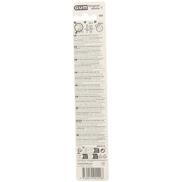 Pour une efficacité maximale, utilisez la brosse à dents Gum Original White en combinaison avec le dentifrice blanchissant de la même gamme. Cette synergie permettra de retrouver un sourire éclatant brossage après brossage.