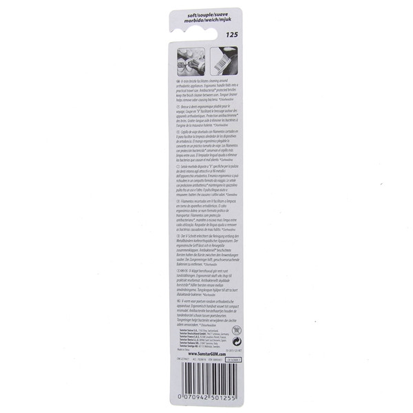 Grâce à sa coupe en V, le brossage autour de l'appareil orthodontique et des dents est facilité. Cette brosse à dent possède des brins souples avec une protection anti-bactérienne et un gratte-langue qui aide à éliminer les bactéries à l'origine de la mauvaise haleine. Le manche est équipé d'un système de ventilation pour éviter l'excès d'humidité. Sa maniabilité est renforcée par un emplacement réservé au pouce.