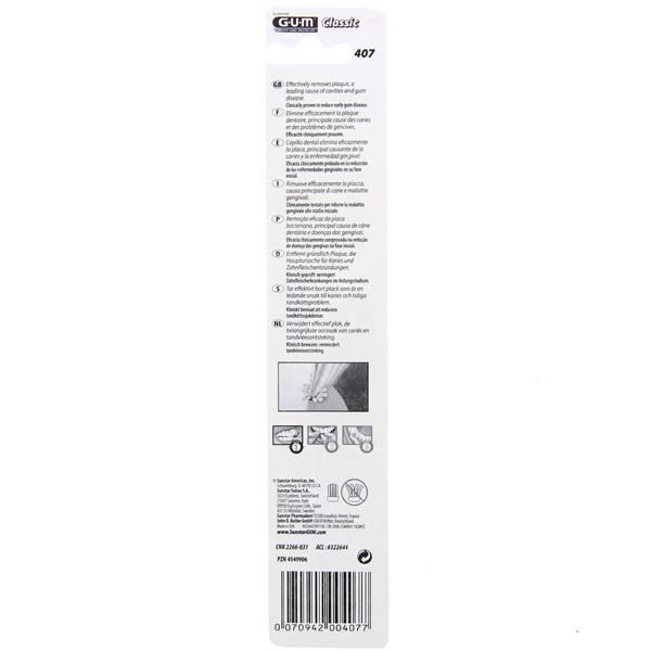 La brosse à dents Classic N°407 de la marque Gum possède 4 rangs de brins souples et une petite tête pour nettoyer efficacement et aisément les dents et les gencives afin d'éliminer la plaque dentaire responsable des caries et des problèmes de gencives.