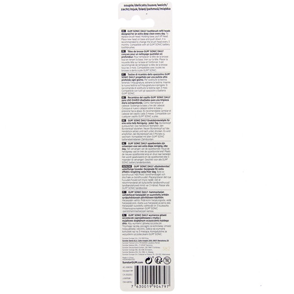 Recharge 2 têtes souples N°4110 pour la brosse à dents à pile Sonic Daily de la marque Gum. Ces têtes de brosse sont conçues pour un nettoyage quotidien ultra doux et en profondeur. Compatibles avec toutes les brosses à dents à pile Gum Sonic.