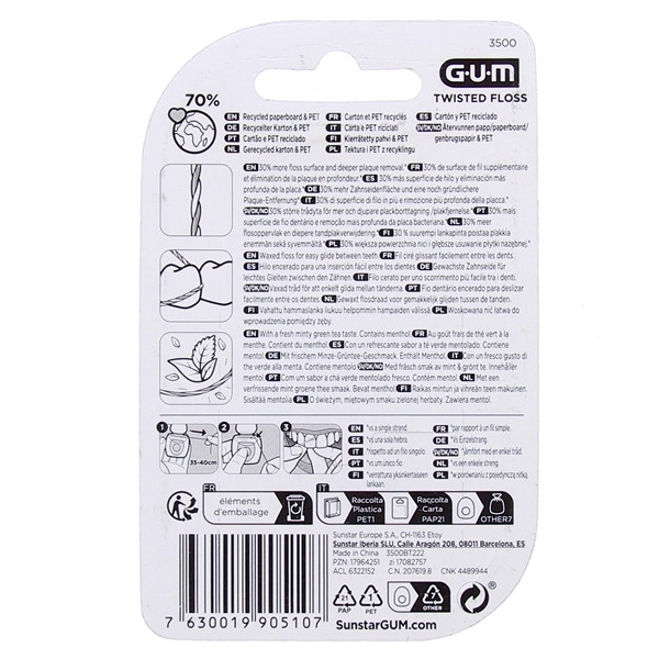 Le fil dentaireTwisted Floss de la marque Gum est un fil torsadé ciré avec 30 % de surface de fil supplémentaire par rapport à un fil simple pour éliminer efficacement la plaque dentaire. Il contient du menthol et offre un goût frais de thé vert à la menthe.