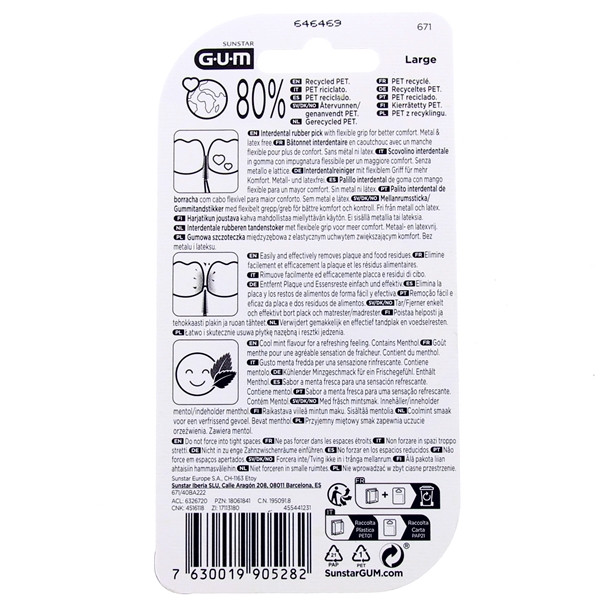 Les bâtonnets interdentaires Gum Soft Picks Comfort Flex sont fabriqués à partir de caoutchouc souple. Ils assurent un nettoyage en douceur des dents et des gencives. Ils sont dépourvus de métal pour éviter toute blessure des gencives et ne contiennent pas de latex. De plus, Ils renferment une touche de menthol.