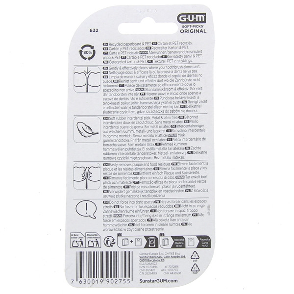 Le bâtonnet interdentaire Soft-Picks Original (N°632) de la marque Gum est recommandé pour éliminer les résidus alimentaires et les plaques dans les espaces interdentaires. Il peut être utilisé quotidiennement après le brossage des dents.