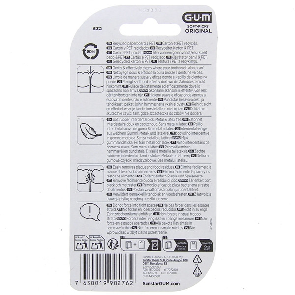 Le bâtonnet interdentaire Soft-Picks Original (N°632) de la marque Gum est recommandé pour éliminer les résidus alimentaires et les plaques dans les espaces interdentaires. Il peut être utilisé quotidiennement après le brossage des dents.