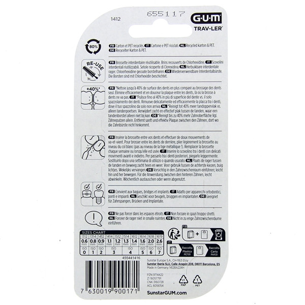 Les Brossettes interdentaires 0,9 mm Trav-Ler sont fabriquées par la marque Gum qui en propose une large gamme afin de s’adapter aux besoins de chaque utilisateur. Ces brossettes se déclinent en 10 tailles différentes, chaque référence étant présentée en lot de 6 brossettes conditionnées sous blister.