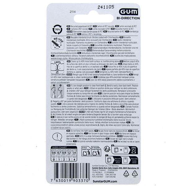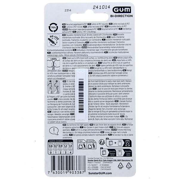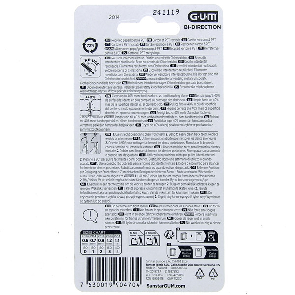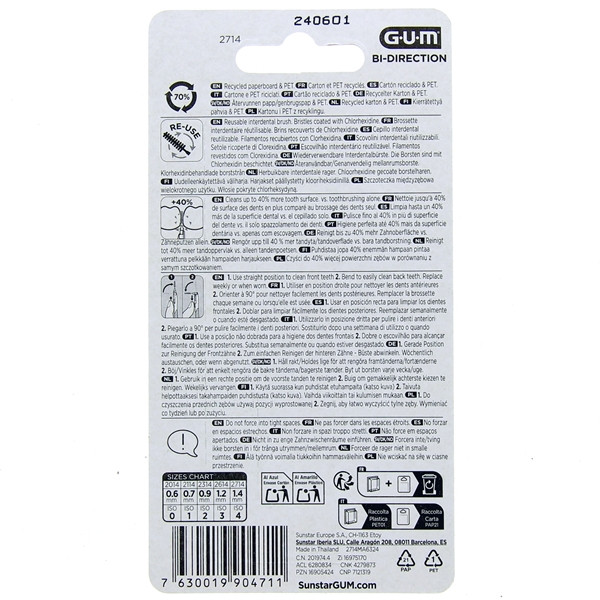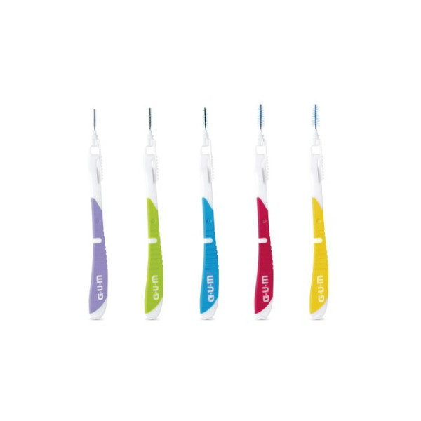 Chaque taille de brossettes interdentaires Bi-direction 2 en 1 Gum est conditionnée en blister de 6 unités.