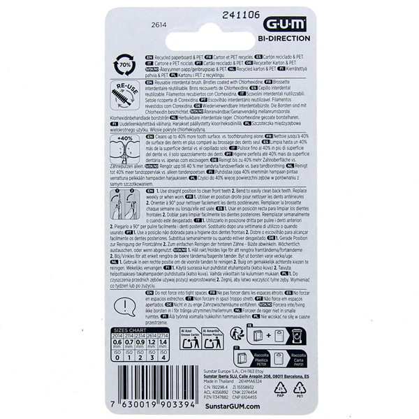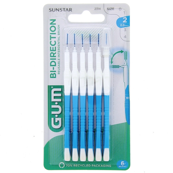 Les brossettes interdentaires Bi-direction de la marque Gum existent sous trois formes différentes suivant les diamètres de passage entre les dents : 0,6 mm, 0,7 mm ; 0,9 mm ou 1,2 mm, 1,4 mm.