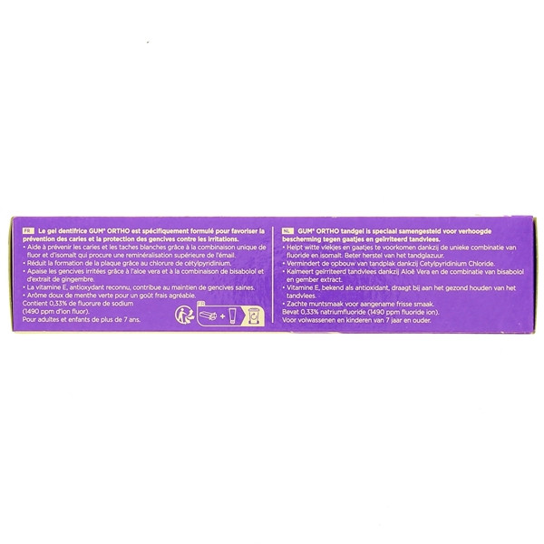 Le dentifrice Ortho de la marque Gum est un gel fluoré conçu pour nettoyer efficacement les dents et l'appareil dentaire tout en protégeant efficacement les gencives des irritations et en renforçant l'émail des dents. Il est destiné aux adultes et aux enfants de plus de 7 ans.