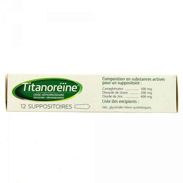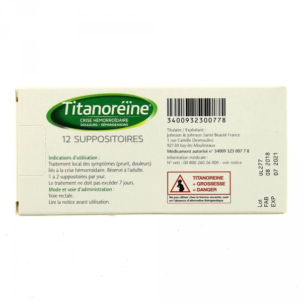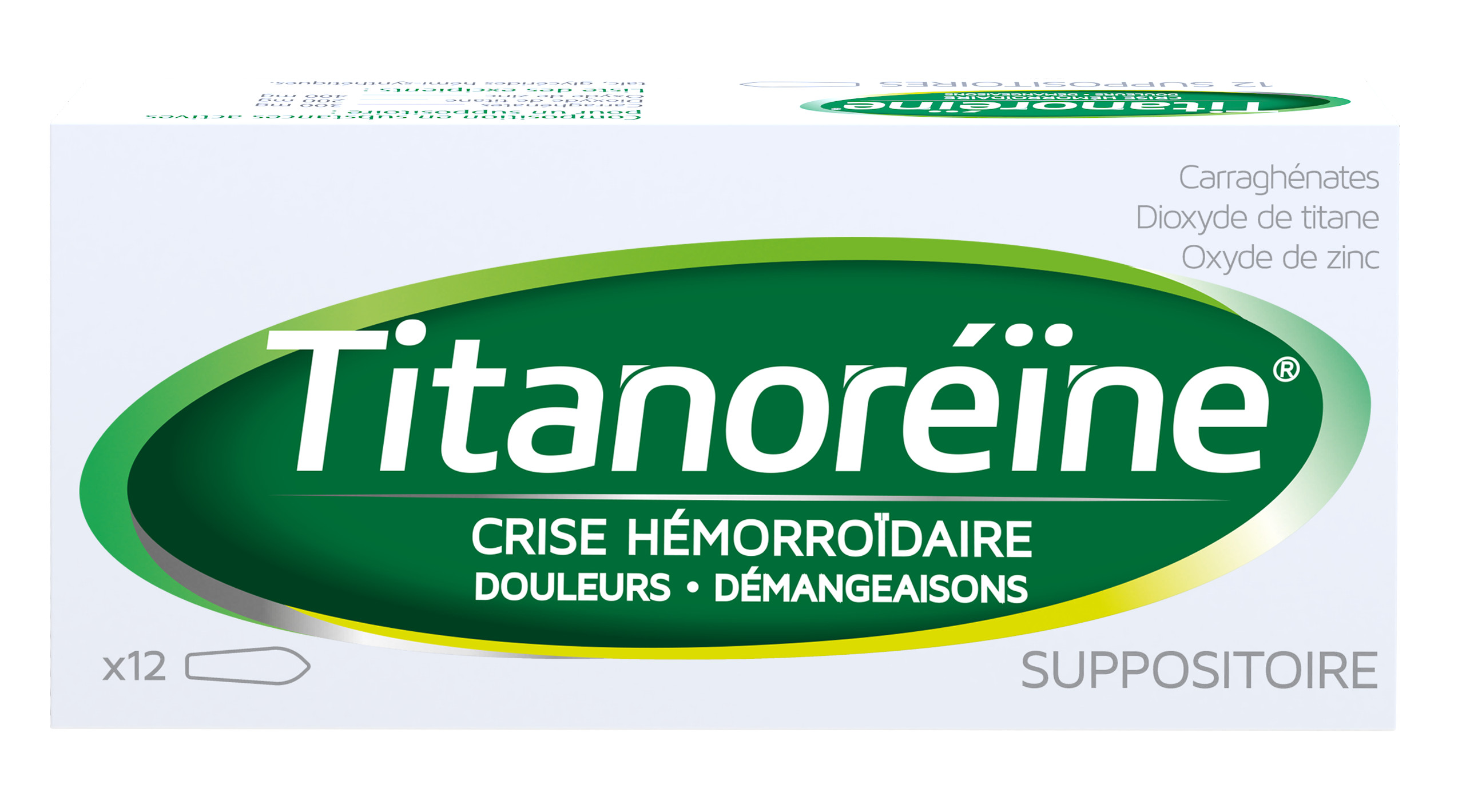 Boîte de 12 suppositoires Titanoréïne des laboratoires Johnson & Johnson.