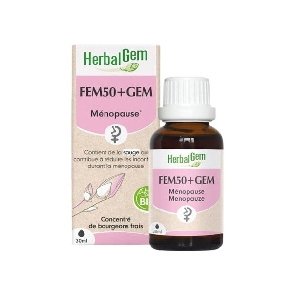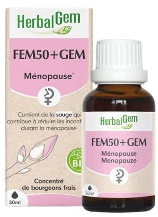 FEM50+GEM Bio d'Herbalgem est un complexe d'extraits de bourgeons frais issus de l'agriculture biologique. Ce complexe contribue à réduire les inconforts liés à la ménopause.