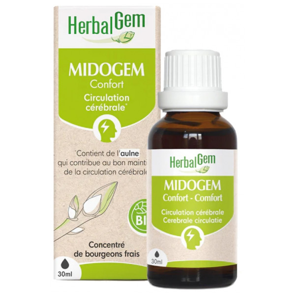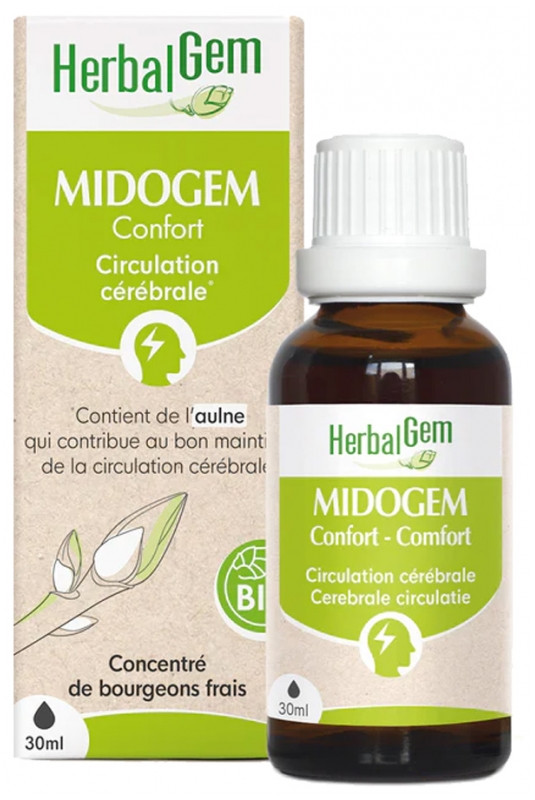 Midogem Bio Herbalgem est un complément alimentaire associant les bourgeons d'aulne glutineux, de noisetier, une teinture mère de grande camomille et des jeunes pousses de rosier sauvage pour contribuer au bon maintien de la circulation cérébrale.