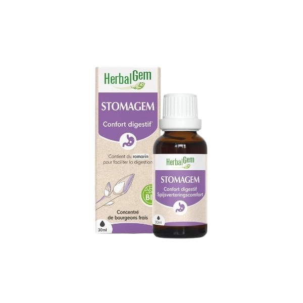 Stomagem Spray Bio d'Herbalgem est à base de macérats glycérinés : d'écorces de jeunes tiges de Citron, de jeunes feuilles de Romarin et de bourgeons de Sureau et de Figuier. Ce complexe est indiqué en cas d'inconforts digestifs (écœurements, nausées, vomissements…). Il est idéal pour le mal de voyage.