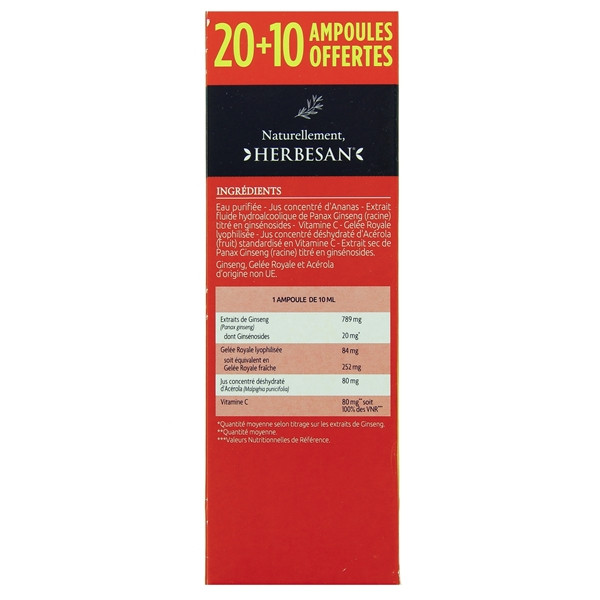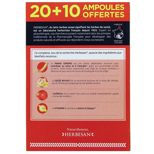 Les ampoules Booster d'Énergie du laboratoire Herbesan, à base de Panax Ginseng, Gelée Royale, Acérola et Vitamine C, sont indiquées pour contribuer au tonus et à l'énergie.
