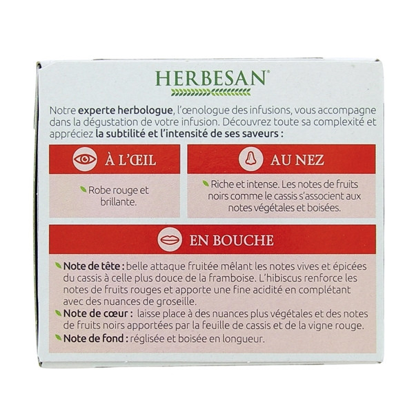 En effet, à travers une subtilité ultime de ses saveurs, Herbesan Bio Circulation procure une note douce et boisée de cassis. On retrouve également une touche onctueuse de framboise. Le mélange des fruits noirs comme le cassis et la framboise apporte une vertu totalement apaisante en soutenant la circulation. Herbesan Bio Circulation est une délicieuse infusion qui contient tous les bienfaits de l’hibiscus. Ce dernier aide au bon fonctionnement des microvaisseaux afin d’alléger la sensation de jambes lourdes.