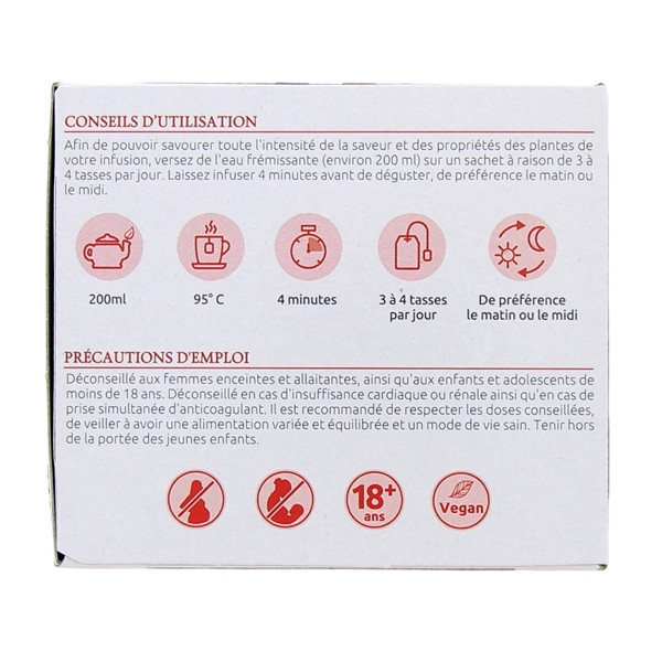 Cette décoction est un produit 100 % français et convient à tout le monde y compris les végans. Elle est conditionnée en 20 sachets individuels de 1,5 g chacun. Son emballage est constitué d’étui en carton 100 % recyclable.