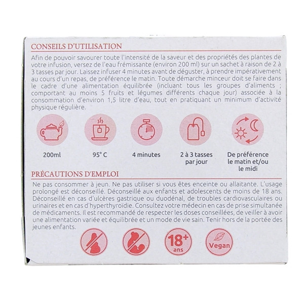 Cette décoction possède d’innombrables vertus à travers le maté et le thé vert pour brûler les graisses et apporter un soutien dans le cadre d’un régime minceur. L’hibiscus contribue à la vitalité et la framboise participe à la stabilité organoleptique du phytocomplexe. Il est par contre indispensable de veiller à rectifier les mauvaises habitudes alimentaires en choisissant des nourritures équilibrées et plutôt légères.
