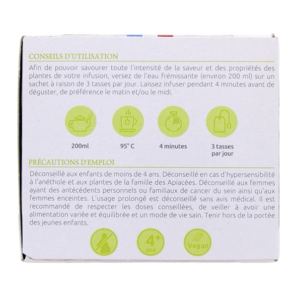 La marque Herbesan propose une boite de 20 sachets d’infusions au fenouil appelée Herbesan Infusion Fenouil bio. Comme leur nom l’indique, les sachets contiennent des graines de fenouil biologiques soigneusement sélectionnées. Ces dernières ont été séchées et infusées dans le but de produire une boisson savoureuse aux propriétés apaisantes. De plus, le fenouil est connu pour son goût légèrement sucré et anisé. Vous avez ainsi la possibilité de déguster l’infusion chaude ou froide. À noter que le fenouil est réputé pour ses nombreuses vertus bienfaisantes pour la santé. En effet, il est souvent utilisé pour aider à apaiser les troubles digestifs, notamment les ballonnements, les spasmes intestinaux, mais également les flatulences. Cela est dû au fait que le fenouil permet de stimuler la production de bile grâce à sa capacité à éliminer les toxines.
